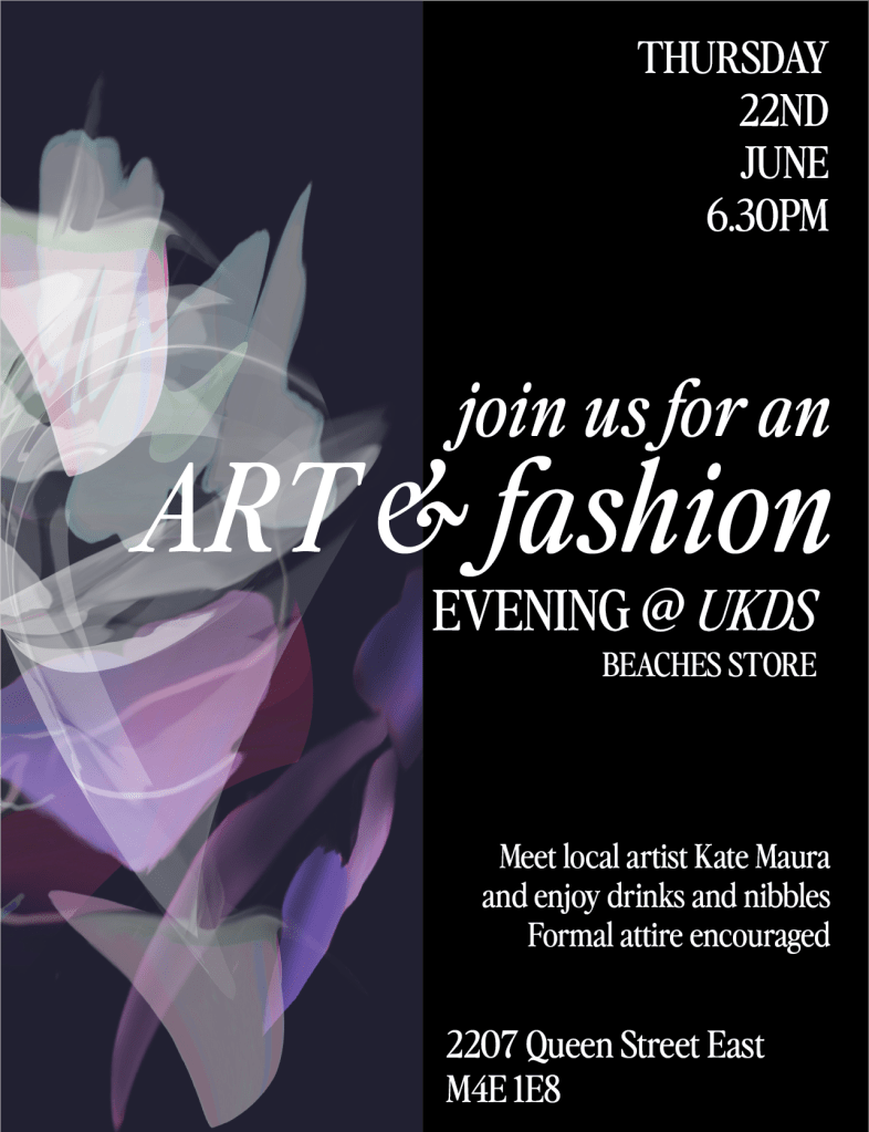 We’re hosting a fabulous ART & FASHION evening at our Beaches store next Thursday evening. Come and meet local artist KATE MAURA, enjoy some drinks and nibbles – and of course shop UKDS!