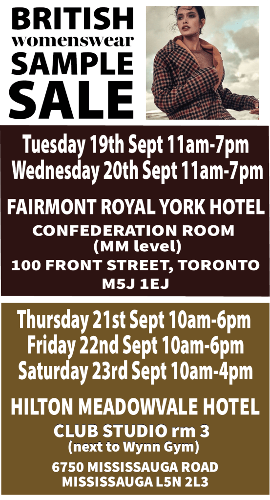 Our week long Fall womenswear sale starts this Tuesday and Wednesday at The Royal York Hotel, moving to Mississauga on Thursday 21st for three days! Great deals on British fashions – new stock added daily! Be there or be square!