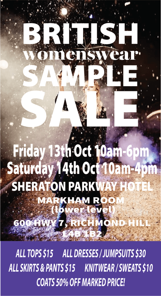 Our Christmas fashion sale at The Sheraton Parkway Hotel starts next Friday – beautiful seasonal British fashions – all at terribly affordable prices!