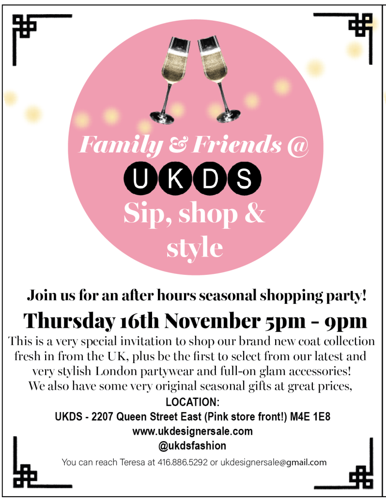 Join us this Thursday from 5pm – 9pm for our seasonal shopping party at our beautiful Beaches store. Everything in store is 10% off for this evening only, including our latest and just arrived in fashion coat collection! Shop for yourself, shop for gifts and shop for fun! Beverages and snacks will be supplied!
